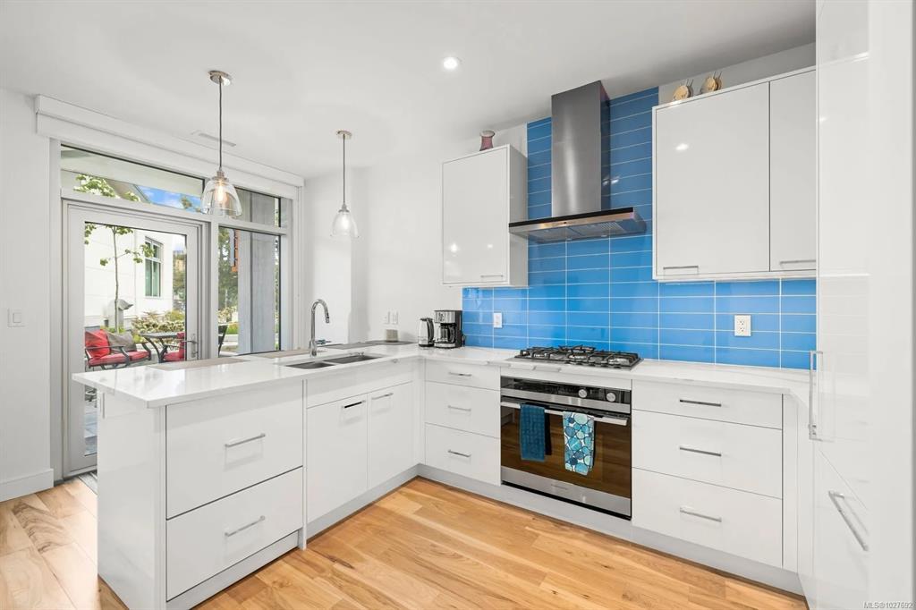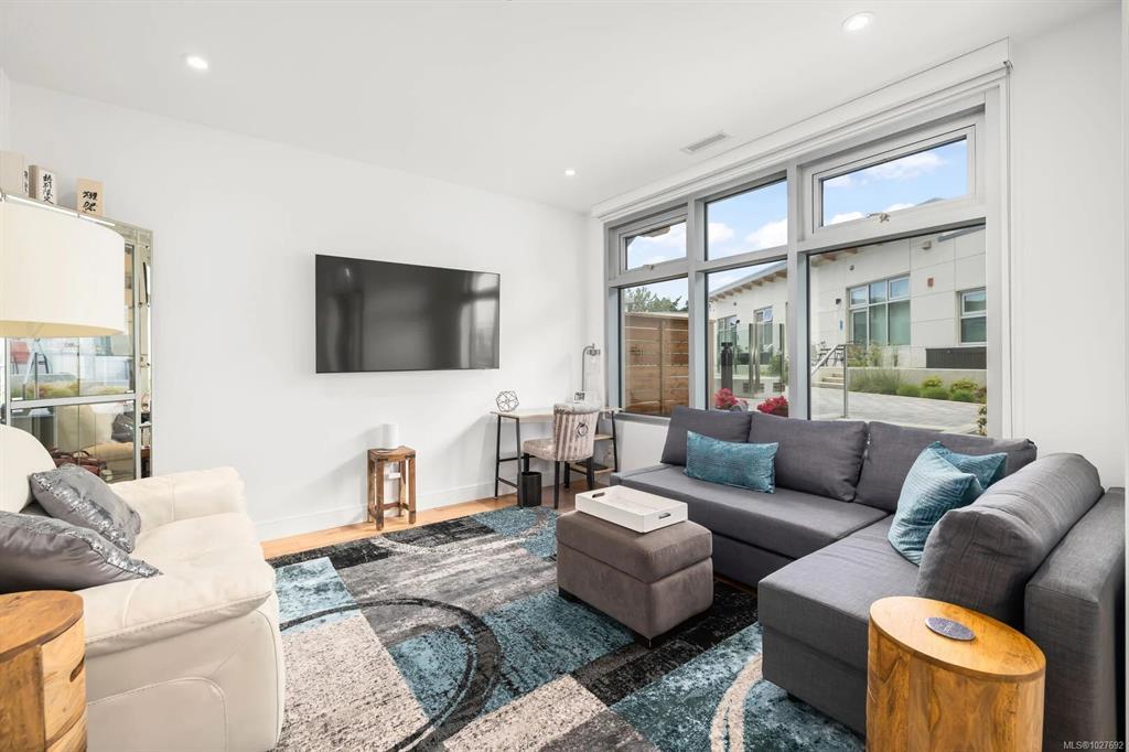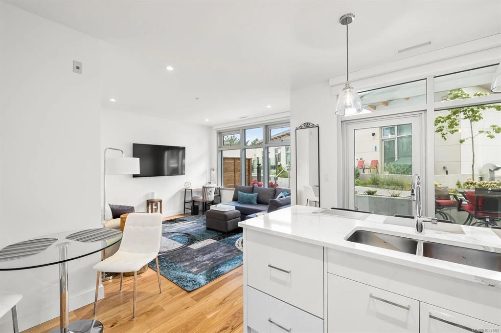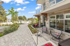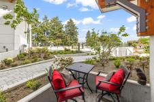 This ground-floor 1BR corner unit features 9' ceilings, hardwood floors, and premium Fisher & Paykel appliances including a gas range. The northeast corner position offers a private exterior entrance and a generous patio perfect for morning coffee. Built to last with steel & concrete construction and a metal roof, the unit also features a heat recovery system for year-round comfort — heat and hot water are included in strata fees. Secure underground parking, bike and kayak storage, and pet-friendly bylaws that welcome large breeds round out an impressive package. The unit is currently generating above-market rental income as an executive rental with professional management already in place. All furnishings are negotiable. Steps to West Bay Marina, Saxe Point Park, and the Esquimalt waterfront walkway