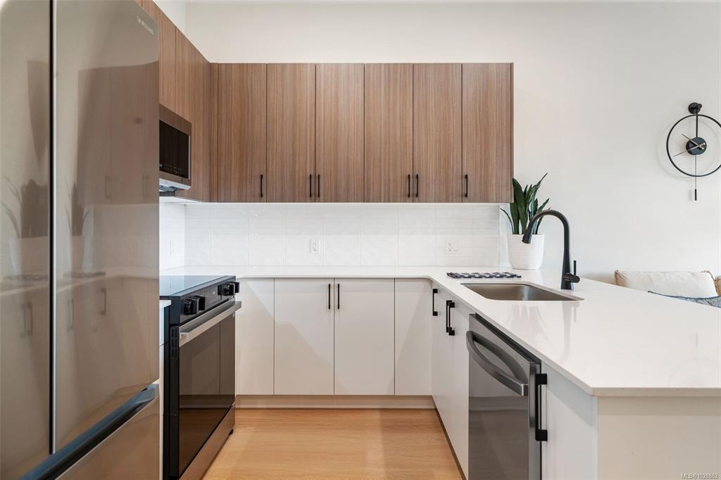TOP FLOOR TEN-FOOT CEILINGS & GST INCLUDED IN PRICE! ONLY 3 UNITS REMAIN AT WINSTER COURT. Exciting Times for buyers, take advantage! MOVE IN READY! 5% deposit! A unique 2-bed, 2-bath floorplan. A spacious southeast-facing balcony offers stunning views. Viking Properties was awarded 2025's Best Home Builder in the Westshore and now presents Winster Court. Heat/cooling pump, EV-ready parking stalls, Samsung Elite SS appliances, wide plank luxury vinyl floors, tile backsplash, quartz countertops & spacious decks to give each residence a welcoming, contemporary feel. Ply-Gem, x-large windows provide plenty of natural light! Lifestyle conveniences such as a courtyard, pet areas, rooftop solar panels, & bike storage. Winster Court boasts PREMIUM soundproofing! Pet Friendly, in the Heart of Langford w/ WALKSCORE of 92. The Westshore’s best shops, dining, parks, recreation & best biking trails including the E&N trail system right outside your front door.