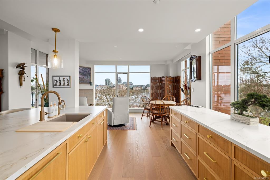 One of Victoria’s most prestigious waterfront addresses, Shoal Point presents this beautifully just completed $500K reno corner residence with breathtaking 180° views over the Inner Harbour, Fisherman’s Wharf & surrounding parkland. Walls of floor-to-ceiling windows fill the interior with natural light, creating an elegant coastal retreat. The designer kitchen features quartz counters, custom cabinetry, prem. appl. & generous workspace while enjoying ever-changing harbour vistas. Sophisticated living & family rooms each offer a gas FP, ideal for relaxing or entertaining. The spacious primary suite enjoys a private balcony & spa-inspired ensuite with heated flrs, mirrors, towel warmer & oversized W/I shower. A generous 2nd BR with its own ensuite provides excellent guest accommodation. Electric blinds, built-ins, heating/AC, secure UG parking, storage & Shoal Point’s concierge & resort-style amenities complete this exceptional offering at one of Victoria’s finest luxury residences
