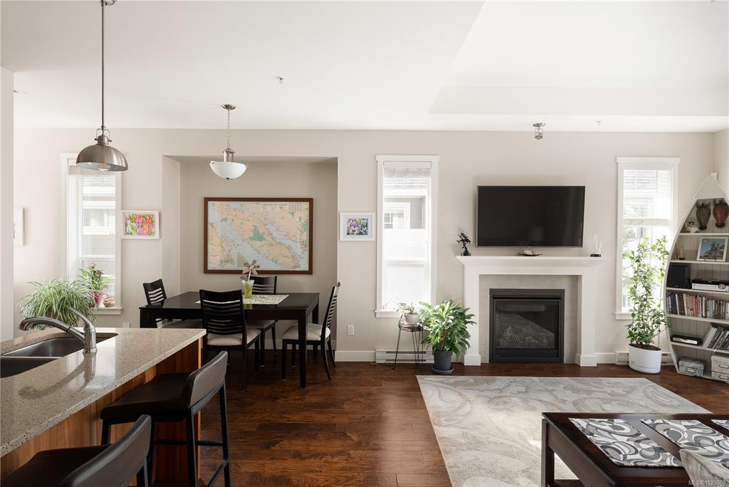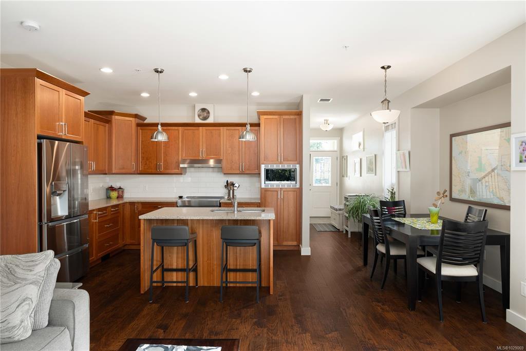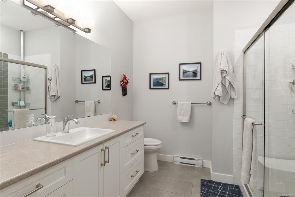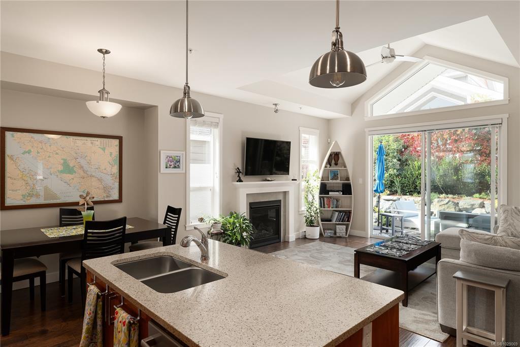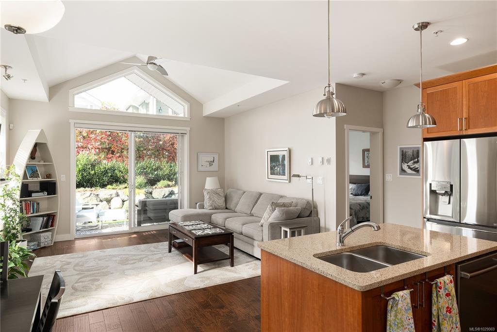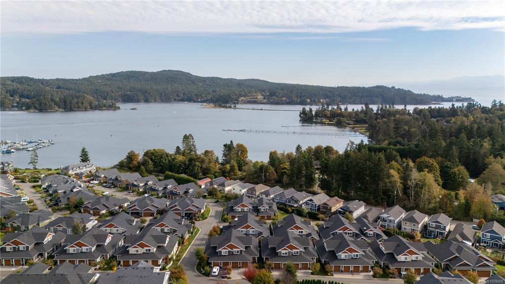 Quiet & private end-unit at Heron View Villas! Flooded with natural light from being an end unit, this immaculate 3-bed, 3-bath home, which shows like new, offers the sought-after main-level living floor plan. The primary suite (with a walk-through closet and ensuite), laundry, and living are all on one floor. The gourmet kitchen features a large island, timeless wood cabinetry, quartz counters, stainless steel appliances, and an induction range. The living room impresses with a vaulted ceiling and gas fireplace, opening to a private, sun-soaked west-facing patio, your perfect spot for afternoon sun. Upstairs offers 2 generous beds and a full bath. Storage is abundant with an overheight 12' double garage and an easy-access crawl space under the entire home. Enjoy resort-style amenities including an outdoor pool, hot tub, sauna, gym, tennis court, firepit, and ocean access next to Sooke Harbour Marina. A premier home in a premier location!