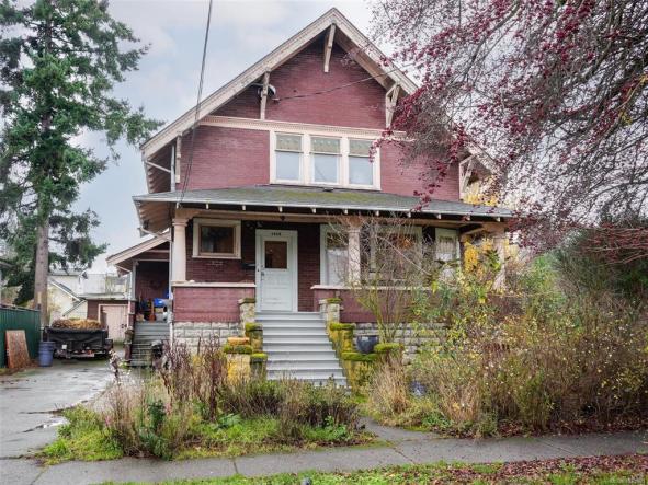 This 1910 legal up-and-down duplex offers a two-bedroom unit on the main floor, a two-bedroom unit on the upper floor, plus an additional two-bedroom suite on the lower floor. There are grain fir floors throughout the main and upper units, with thin-strip oak floors in the entrance foyer. Many of the windows on the main floor are stained glass. There…